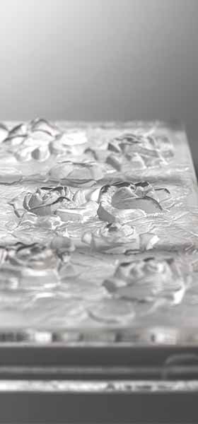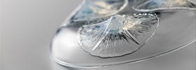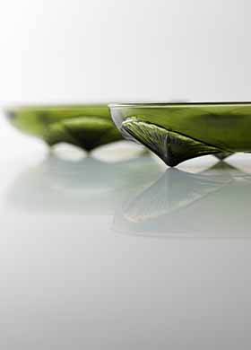 その特徴は目的に合わせてガラスの粒子の細かさや色の種類・濃淡などを自由に調合でき、その色は内部に浸透し豊潤な色彩を放ち、普通のガラス製品では表現することができない味を持たせることができる点です。